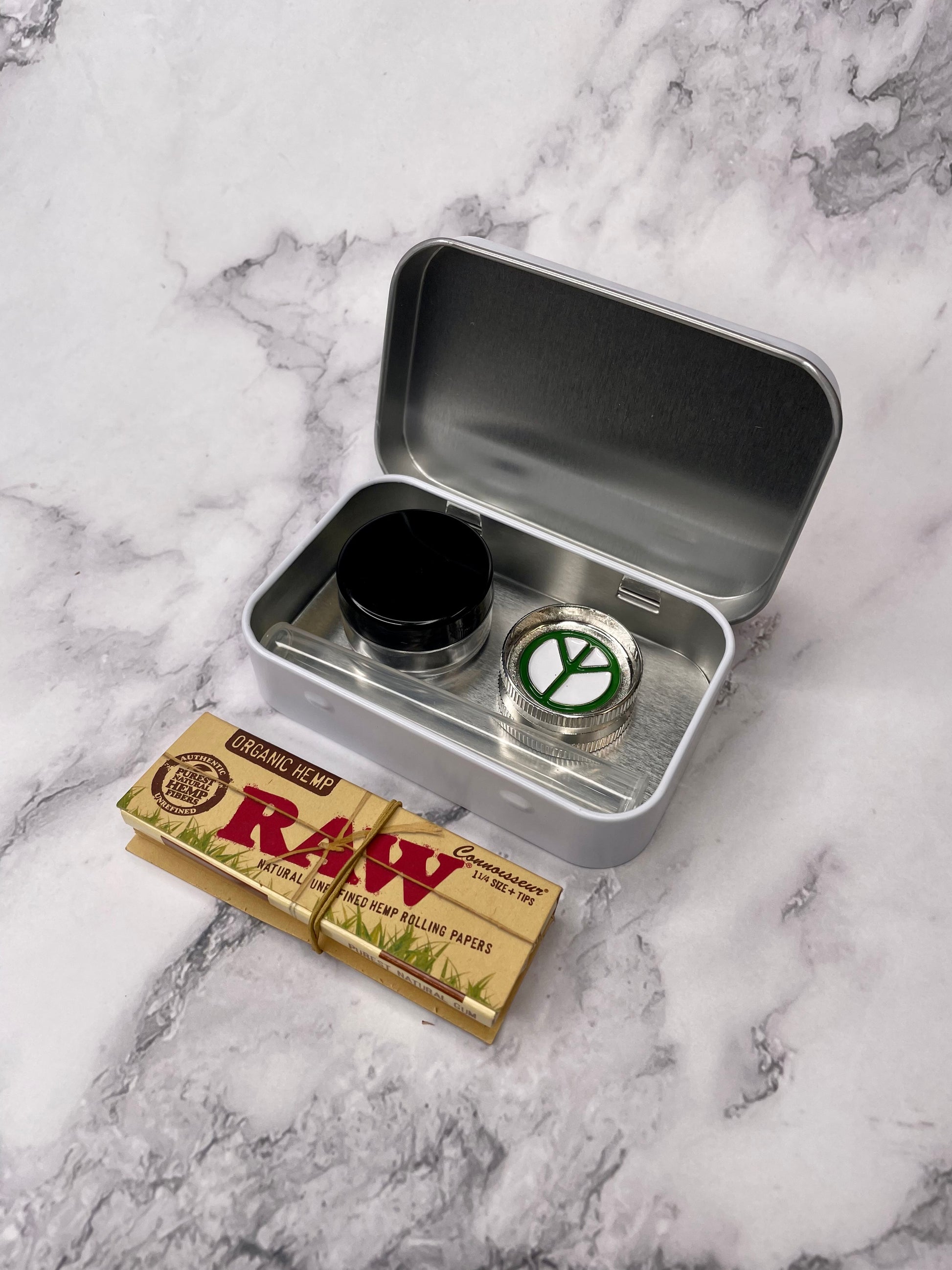 - x1 compact stash tin: 9.5cm (L) x 6cm (W) x 2.1cm (H)